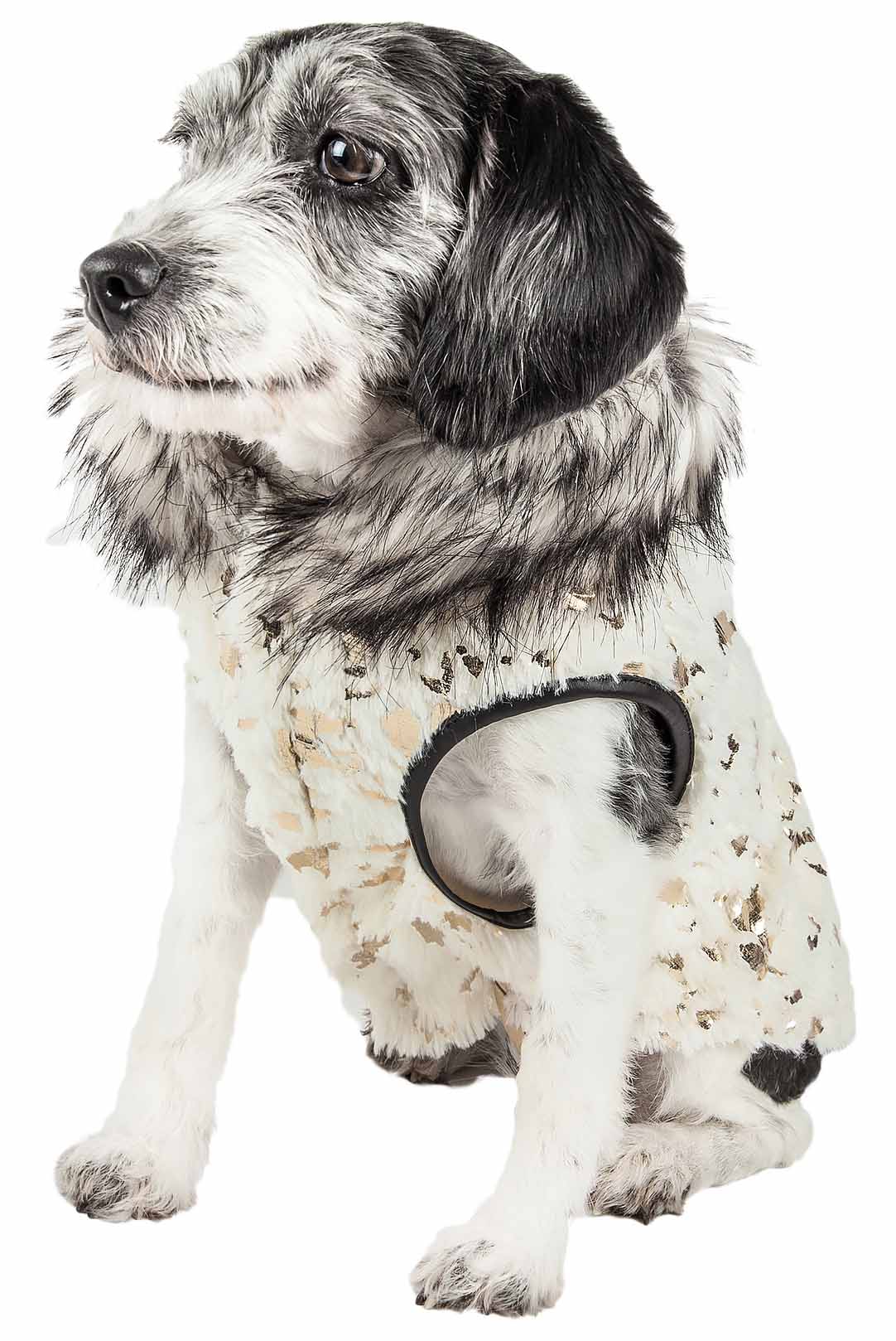 The Pet Life LUXE 'Gilded Rawflled' Gold-Plated Designer Fur Dog Coat features a Stunning Gold Plated Pattern along the back side embedded on an Buttery-Soft Faux-Fur solid Beige exo-shell and the Reverse is lined with Polar Fleece for added comfortability and warmth that gently hugs the body. Additionally this coat features Sponged sided lining for superior craftsmanship and durability by the sleeve areas with an Accented Trendy Faux-Fur Collar. Features Tough-Grade Velcro Belly Enclosures for convenient on and off access and a leash slit below the Neck line. This jacket is part of our Pet Life Luxury collection. Available in Multiple Sizes.