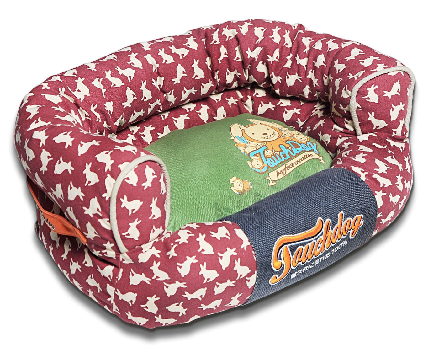 The Touchdog Lazy-Bones Rabbit-Spotted Premium Easy Wash Couch Dog Bed is composed of a Cotton-Polyester Outer shell and Inner-Lined with Plush Polyester. Additionally this Pet Bed features a Reversible and Removable cushion. The cushion has the ability to zip open for machine wash placement of the inner polyfill contents. Has a Couch-like appearance and features accented thick stitching along the couch borders. Complimented with the Touchdog Embroidered stamp of perfection along the front with a designer print on the accented Removable and Reversible Polyester-Cotton plush cushion. Every intrical trim is designer coordinated to compliment. Completed with a built-in side carrying handlebar. Touchdog, the leading Premium Pet Brand of Tomorrow. Available in Multiple Sizes Colors