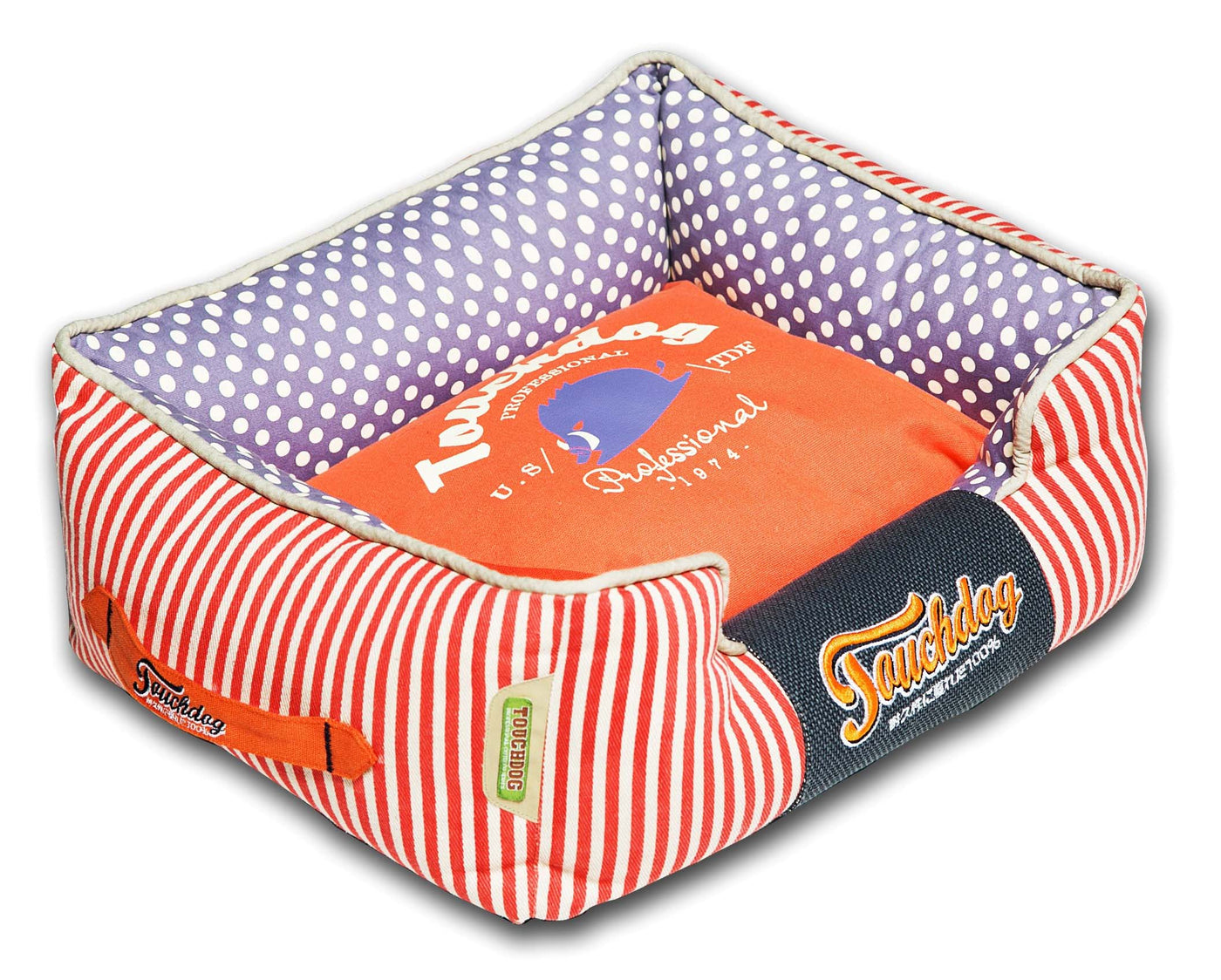 The Touchdog Polka-Striped Polo Easy Wash Rectangular Fashion Dog Bed is composed of a Cotton-Polyester Outer shell and a Reversible and Removable and Reversible Polyester inner dog cushion. The cushion has the ability to zip open for machine wash placement of the inner polyfill contents. Features a Fashion Polka-Dot and a Striped Polo design pattern on the outside with a beautiful print design on the cushion with the Touchdog Embroidered stamp of perfection on the frontal lip. Composed of a Higher-Grade level of Poly-Fill for superior plush. Features a Nylon side handle for ease of mobility when carrying. Touchdog, the leading Premium Pet Brand of Tomorrow. Available in Multiple Colors.