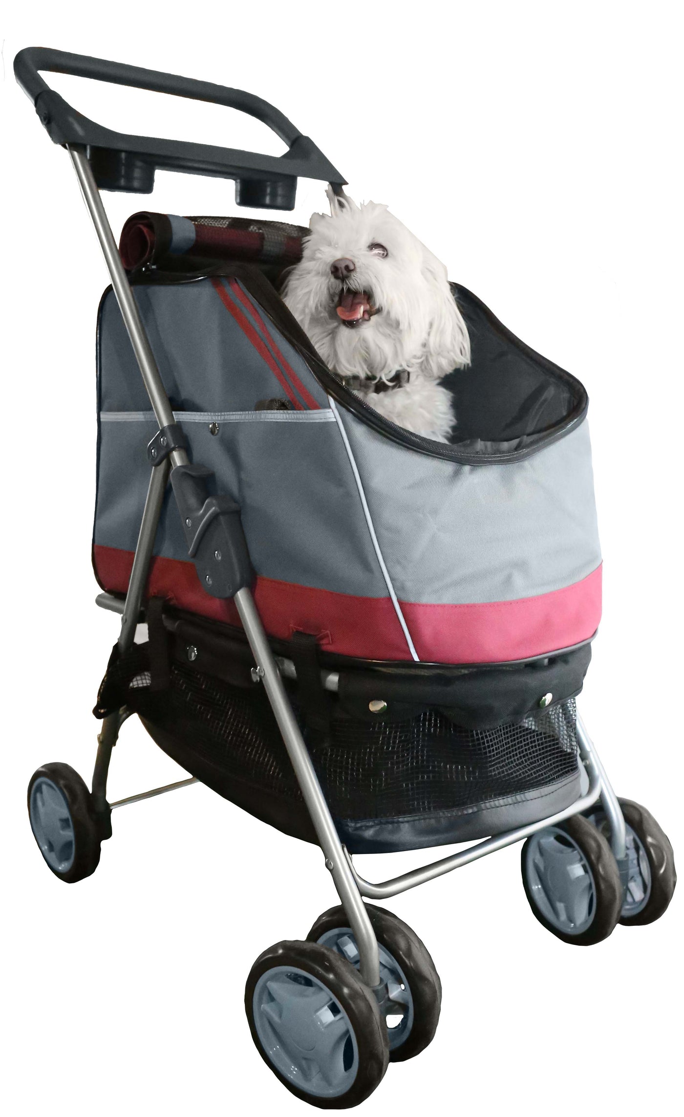 The Pet Life 'All Surface' Multi-Purposeful 3-in-1 Dog Stroller, Dog Carrier and Dog Car seat is composed of High-Grade Heavy Duty Ballistic Nylon Fabrics and Tough PVC Handle-Bars. This enables it to stroll up to 70 Lbs of weight. This Dog Stroller Features High-Quality Dual Front Rubberized Wheels built for traction resulting in a comfortable walk. A Built-In Bottom Tray saves you from carrying an extra bag for additional items. This Pet Stroller Features a Zip-Off Mesh and Nylon and a Dual Bottle Tray within the Push Handle bar. You can quickly convert it into a Pet Carrier or Car Seat by easily un-strapping the Nylon component within the Dog Stroller. The Car Seat functionality sits onto any car seat and fastens to any and all Vehicle Seat Belts. These car seats are extremely essential in preventing any car injury. This piece is the Ultimate Safety accessory for your pet. Included inside the Pet Stroller is a Built-In Leash and Harness connector. The Handle Bars Fold and Collapse to 6 inches thin making it easy to store.