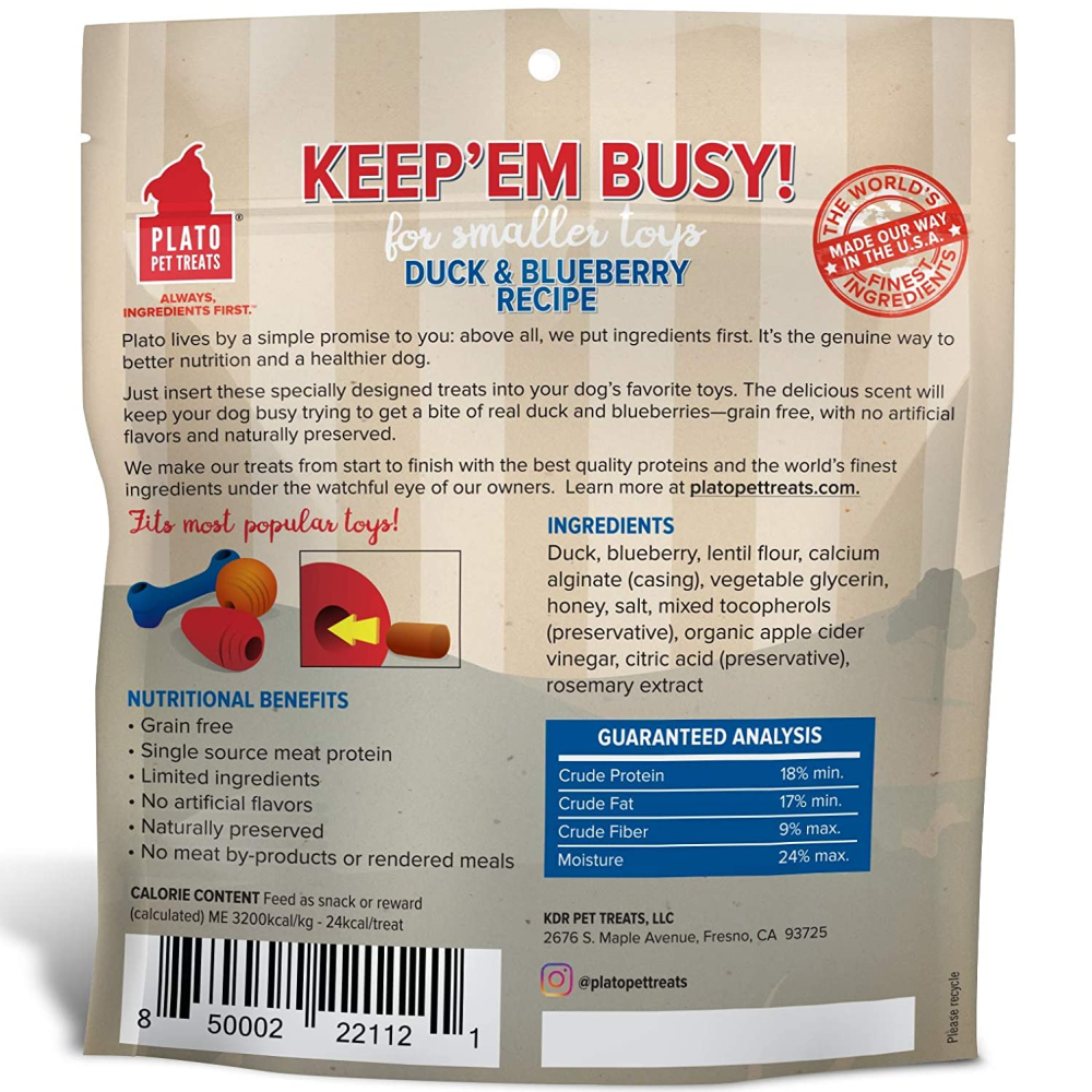 Interactive Toy Treats for Dogs-for Large Toys. Just insert these specially designed treats into your dog's favorite toys. The delicious scent will keep your dog busy trying to get a bite. Keep 'em Busy treats are Grain free and without artificial colors, flavors or preservatives, Zero Fillers, Meals or By- Product. Single Source Real Meat, Limited Ingredients you can trust, Supports Skin and Coat Health and is Naturally Tasty!