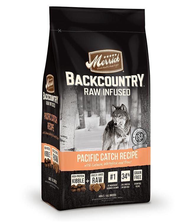 Merrick Grain Free Backcountry Raw Infused Pacific Catch Recipe Dry Dog Food is an ancestral canine diet packed with protein dogs crave. This natural, grain free formula provides your dog with the nutritional benefits of a raw diet they would have discovered in the wild in a safe and convenient recipe that's easy to serve. Real deboned salmon is always the first ingredient. This high quality protein helps build and maintain healthy muscle tissue and energy levels; Freeze-dried raw pieces are mixed into the kibble in a pure state to provide nutritional benefits that are easily digestible and taste great. The raw inclusion goes through rigorous testing and a proven process called High-Pressure Processing (HPP) to ensure food safety; All Merrick Backcountry recipes are rich in Omega fatty acids for healthy skin and coat, and contain leading levels of glucosamine and chondroitin for healthy hips and joints; All Merrick recipes are crafted in our Hereford, TX kitchen and cooked in the USA, in facilities that uphold strict FDA guidelines