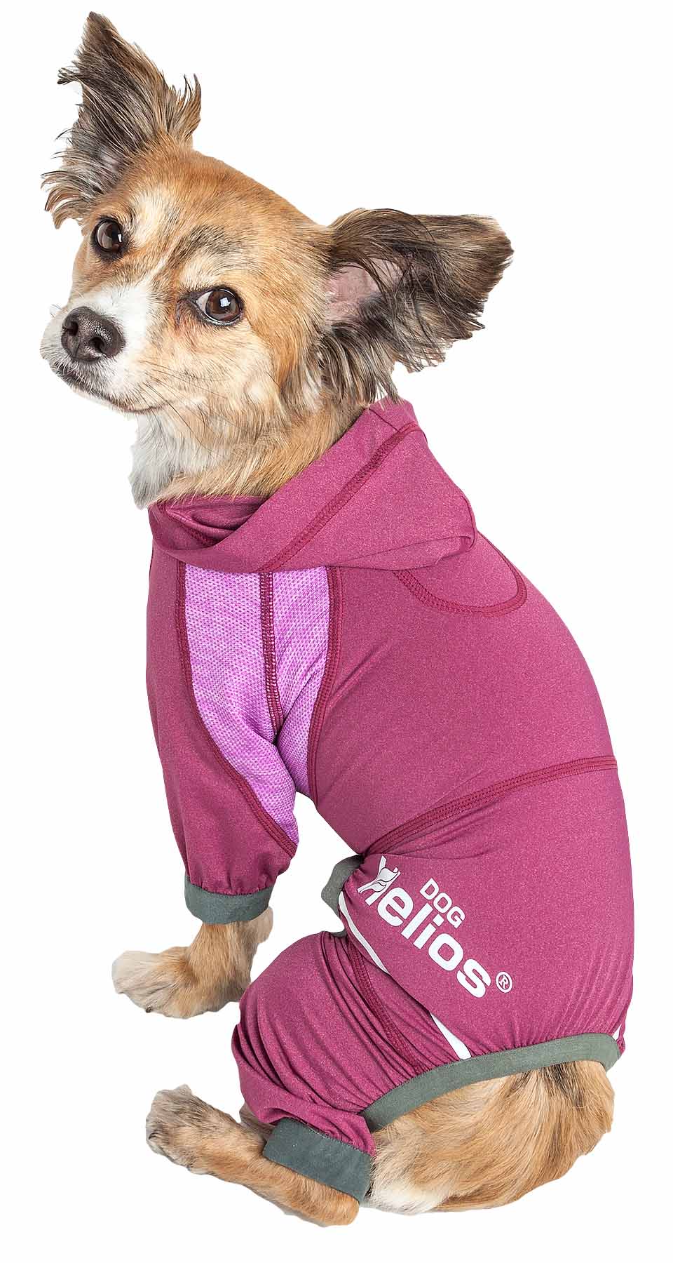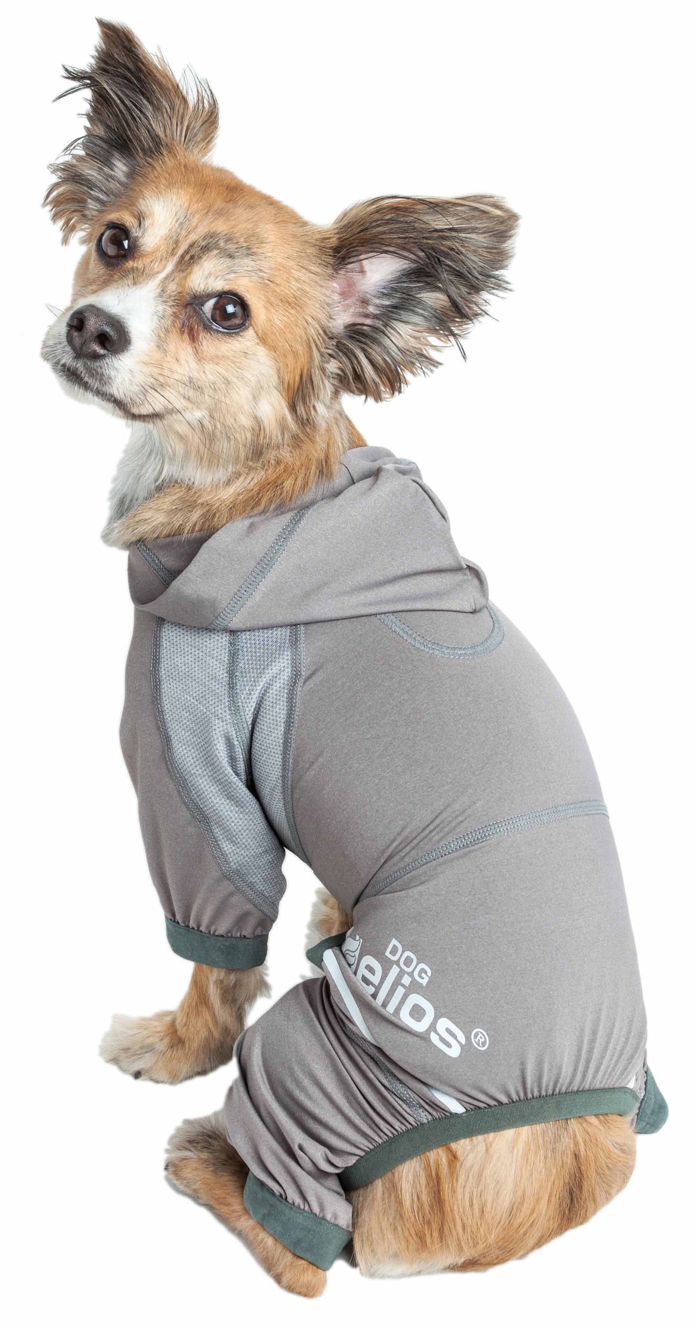 The Dog Helios 'Namastail' Lightweight 4-Way Stretch Breathable Full Bodied Performance Yoga Dog Hoodie Tracksuit is all about next-level tranquility and complete flexibility. The entire body features specially engineered Lightweight ultra-elastic fabrics that fuse together for maximum Flexibility, Mobility and Breathability that is also Permeable. The main Exo-shell features Elastane and Spandex with 4-way stretch technology that moves in every direction. The Namastail Dog Hoodie also features well-coordinated strategically placed perforated stretchy fabrication trims for Strategic Ventilation that adds Breathability. This Yoga Dog Tracksuit also features elasticity around the sleeves and the body for a perfectly uniform fit with added growth room that almost feels like a secondary skin. Features Dual-Reinforced stitching at every seam for Durability and Stability with added reflective lining along the outside for night protection. Additionally, the main exo-shell and trims both feature Quick-Drying technology that dries rapidly and while offering Anti-Odor technology that prevents odor causing microbes. Assists with UV Protection against the suns harmful rays and fitted perfectly to help assist in containment or collection of shedded hairs. Features an easy on and off pull over design and an accented pull-over hood with a leash-slit along the back. Machine Washable. Available in Multiple Colors and Sizes.