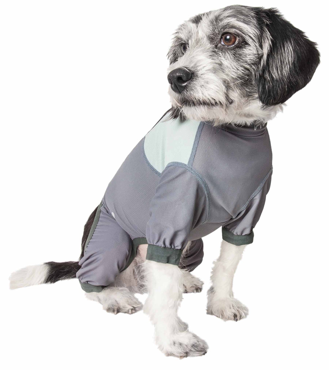 The Dog Helios 'Tail Runner' Lightweight 4-Way-Stretch Breathable Full Bodied Performance Dog Track suit features a Next-Generation system that is specially developed for complete Aeration and Flexibility. This engineered fused fabric features a specially engineered Micro-paneled jersey-like premium elastic material throughout the entire shell that is extremely Flexible and Breathable and features a Smart Ventilation performance system that reacts with the body to maintain body temperature through Permeation. This specially blended fabric features high-level properties of Flexibility for unrestricted Mobility with 100% Breathability. The Exo-shell features 4-way stretch Construction that moves in every direction. The Tail Runner also features banded elasticity around the sleeves and across the body for a nice tapered fit with added room for growth. Features Dual-Reinforced stitching at every seem for Durability with added reflective taping for night protection. Additionally, this tracksuit features Quick-Drying technology that dries rapidly while offering Anti-Odor technology that assists with odor causing microbes. Covers the body providing UV Protection against the suns harmful rays and fitted perfectly to help assist in containment or collection of shedded hairs. Features a fashion collar with a leash-slit along the back. Machine Washable. Available in Multiple Colors and Sizes.