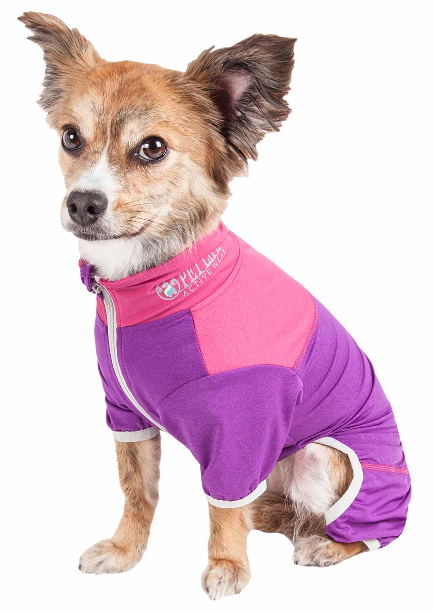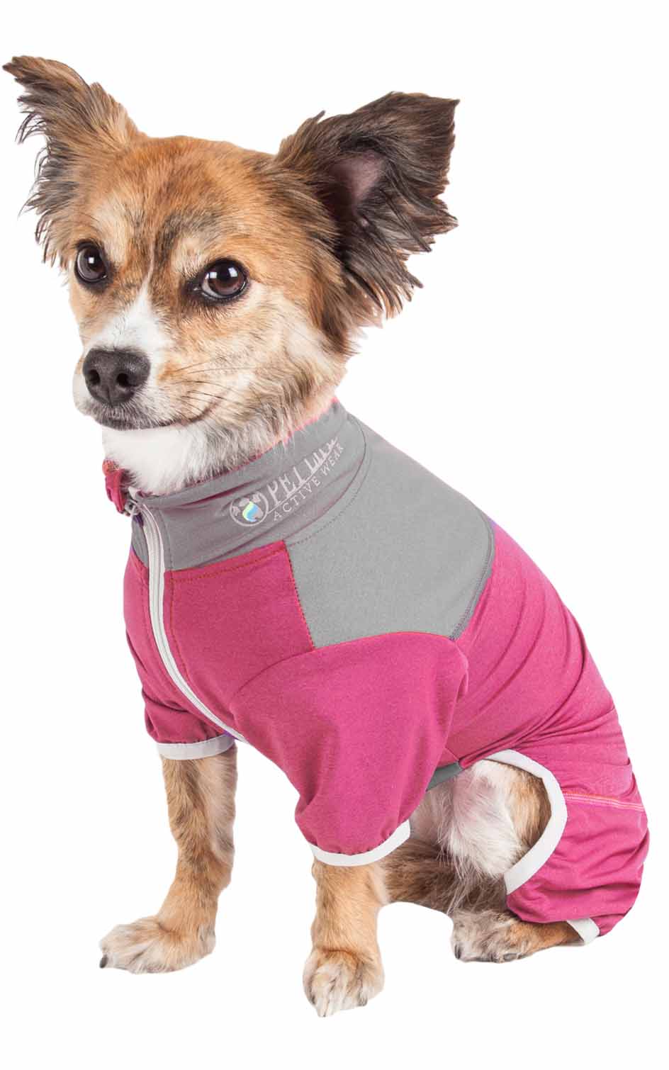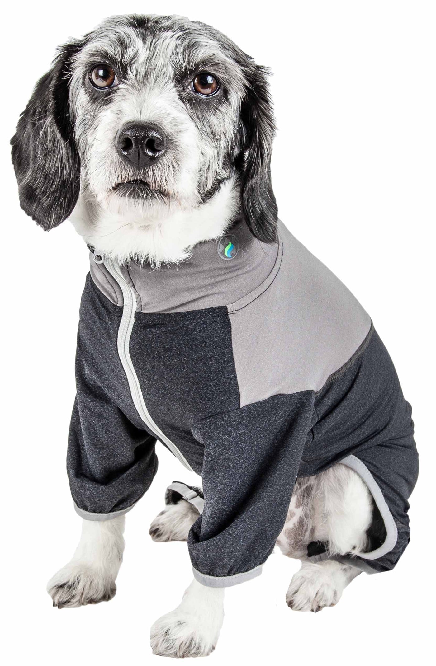 The Pet Life ACTIVE 'Embarker' Dual-Toned Full Bodied Tracksuit is Next-Generation performance unleashed. Features a specially formulated Ultra-Lightweight Micro-knit system that maintains body temperature and features 4-way Stretch technology that moves better in every direction for premium comfort and mobility with strategic ventilation points for Breathability. Features a tapered and streamlined fit that's also expandable with stretch-banded lining that extends additional room for growth. This fabric features Quick-Drying properties that repels perspiration and dries really fast while offering Anti-Odor technology that assists with odor causing microbes. Offers UV Protection against the suns harmful rays and fitted to help assist in containment or collection of shedded hairs. Design features Dual Reinforced stitching at every seam for Durability and a zipper for convenient on and off access with a zippered track protector preventing hairs from entrapment and a leash slit for easy on and off access. Features a sporty stretch collar fashion collar and Reflective Taping for added night visibility. Machine Washable. This style is part of our Pet Life Activewear Collection. Available in Multiple Sizes and Colors.