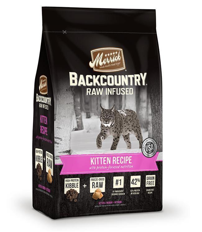 Merrick Backcountry Raw Infused Kitten Recipe Dry Cat Food is an ancestral feline diet packed with protein cats crave. This grain free formula provides your kitten with the nutritional benefits of a raw diet they would have discovered in the wild, in a safe and convenient recipe that's easy to serve. Real deboned chicken is always the first ingredient. This high quality protein helps build and maintain healthy muscle tissue and energy levels; Freeze-dried raw protein pieces are mixed into the kibble in a pure state to provide a nutritional boost, with easy digestion and the fresh taste cats love. The raw inclusion goes through rigorous testing and a proven process called High-Pressure Processing (HPP) to ensure food safety; Specially formulated for growing kittens, this recipe is rich with Omega fatty acids for healthy skin and coat, and contains DHA to support healthy brain development; All Merrick recipes are crafted in our Hereford, TX kitchen and cooked in the USA, in facilities that uphold strict FDA guidelines