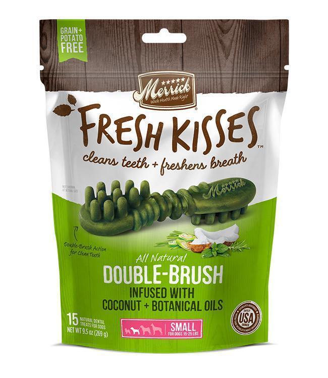 Merrick Fresh Kisses infused with Coconut + Botanical Oils are an innovative, natural dental treat designed not only to clean dogs teeth, but to truly freshen breath at the same time. Merrick Fresh Kisses feature a unique double-brush design that cleans teeth, and uses coconut + botanical oils to freshen breath. These treats are specially crafted to clean teeth. They are tough enough to ensure sufficient chew times, but soft enough to maintain contact with the dog�s tooth to effectively clean teeth; Coconut oil and botanical oils (peppermint oil, lemongrass oil, and rosemary oil) freshen breath in an all-natural way; All-natural, grain-free and potato-free; Available in single packs, resealable pouches, and larger box or bulk options; All Merrick recipes are crafted in our Hereford, TX kitchen and cooked in the USA, in facilities that uphold strict FDA guidelines