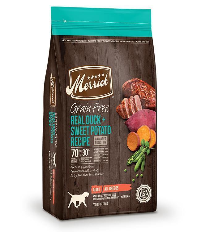 Merrick Grain Free Real Duck + Sweet Potato Recipe Dry Dog Food provides balanced nutrition with real whole foods sourced from local farmers we know and trust. This natural, grain free formula dog food is ideal for all breeds and sizes of dogs with a focus on naturally nutrient rich ingredients to support overall health. Deboned duck is always the first ingredient. This high quality protein helps build and maintain healthy muscle tissue; Leading levels of Omega fatty acids support healthy skin and coat and packed with glucosamine and chondroitin to foster joint health; We use real whole foods like peas, apples and blueberries full of vitamins, minerals and antioxidants, plus easily digestible carbohydrates like potatoes and sweet potatoes offer the benefit of sustained energy without upsetting grain-sensitive systems; All Merrick recipes are crafted in our Hereford, TX kitchen and cooked in the USA, in facilities that uphold strict FDA guidelines