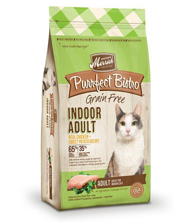 Purrfect Bistro Indoor Adult Recipe is a grain free diet high in quality protein with moderate fat levels and low levels of carbohydrates the kind of diets cats thrive on. Our formula is fortified with vitamins, minerals, probiotics, and antioxidants, ideal for adult cats 1 - 7 years old with a focus on nutrient rich ingredients to support overall health. Real deboned chicken is always the first ingredient. This high quality protein along with chicken and turkey meals, give this recipe a 67% protein level of meat sourced ingredients, making it highly digestible; Rich in Omega fatty acids to support healthy skin and fur, as well as added fiber for hairball control; Real whole foods like sweet potatoes and peas provide easily digestible carbohydrates to support sustained energy without upsetting sensitive digestive systems; All Merrick recipes are crafted in our Hereford, TX kitchen and cooked in the USA, in facilities that uphold strict FDA guidelines