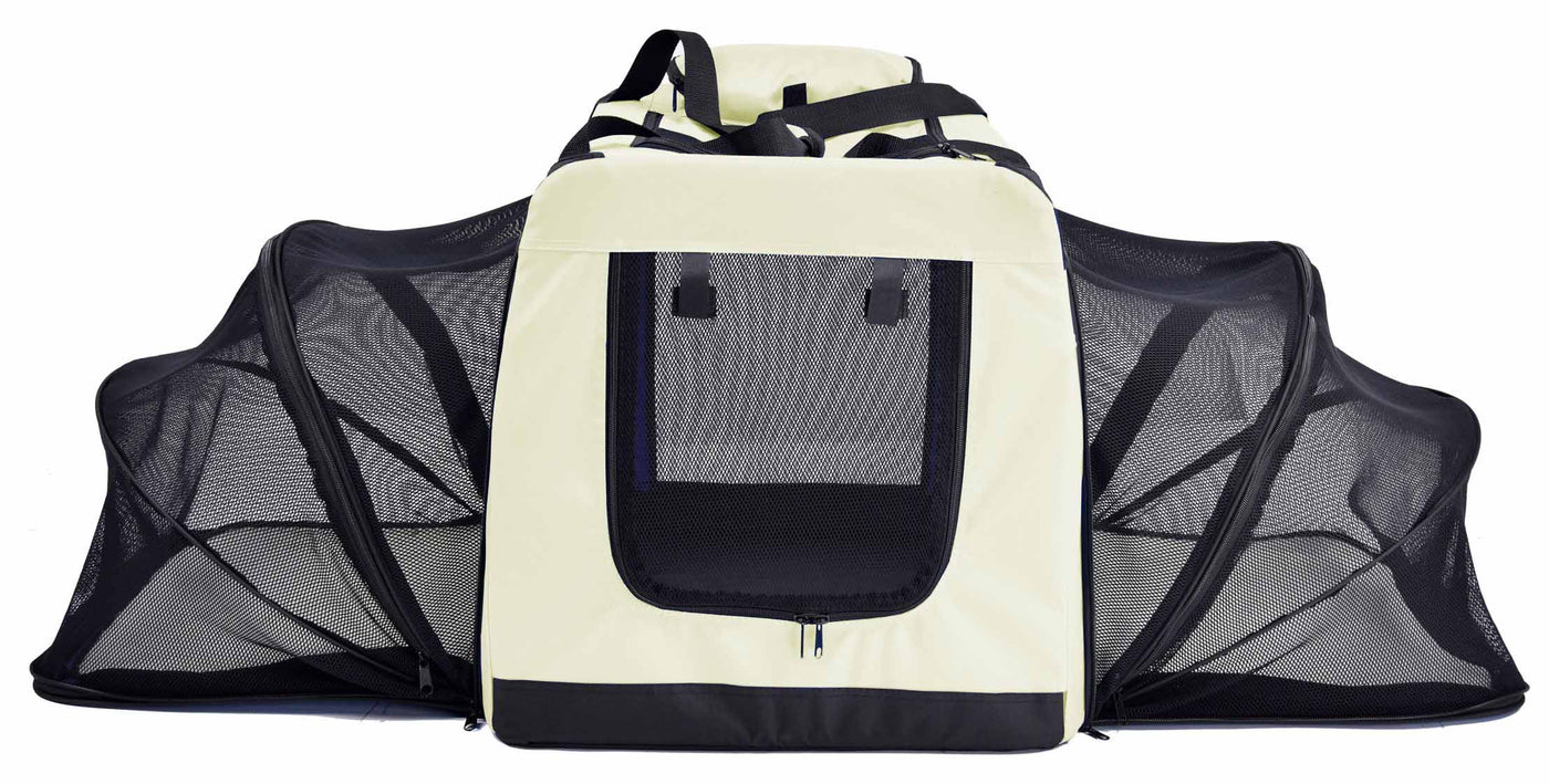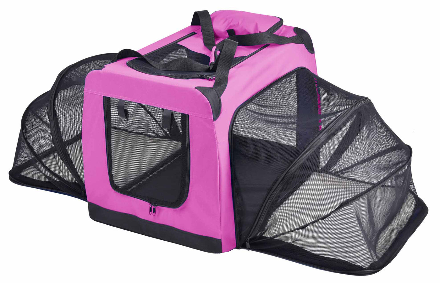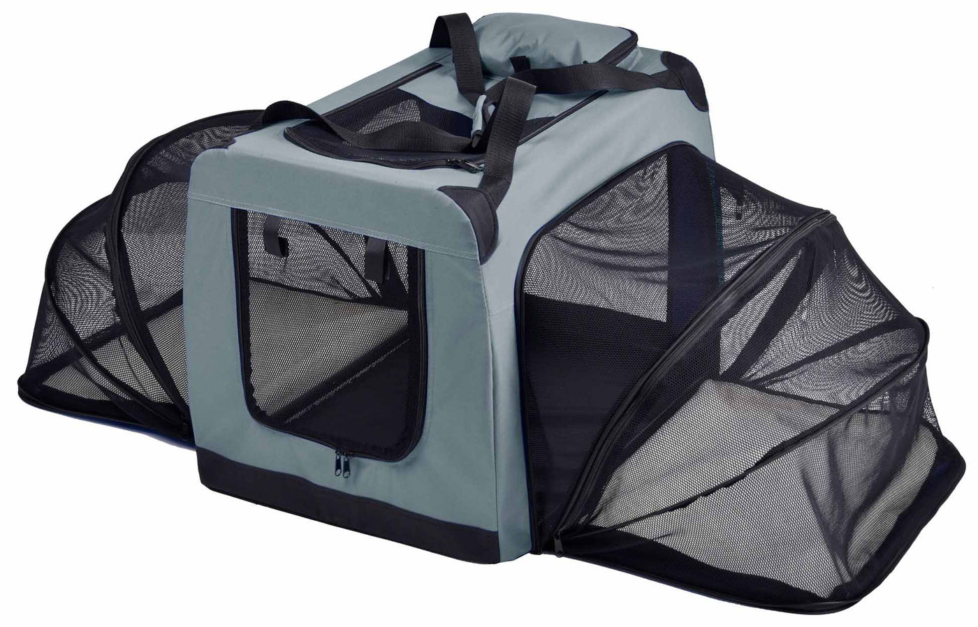 The Pet Life 'Hounda Accordion' Metal Framed Soft-Folding Collapsible Dual-Sided Expandable Pet Dog Crate is specially engineered with 3 times the lounging space. This soft folding crate features dual-sided zippers that zip open and expand on both sides like an accordion for a roomy triple lounging area experience with comfortable and breathable Sherpa-like removable resting pads that Velcro in place on each side. Both accordion-like expandable sided mesh structures feature zippers for additional pet placement. The Hounda Accordion pet crate is composed of a Durable Nylon Exo-Shell and Premium breathable mesh with a Medium-weight sturdy metallic frame that completely folds, collapses and buckles closed into place and locks into place when opened. This crate also features a zippered above-top pouch for placement of belongings and zippered frontal and panoramic entrances for easy pet placement that zips open, rolls up and Velcro's into place while offering complete ventilation and Sunview all around. Additionally this crate features above handle straps for easy carrying and a built-in safety leash holder. Spacious enough for multiple pets and perfect for travel and outdoor areas. Available in Multiple Colors and Sizes.