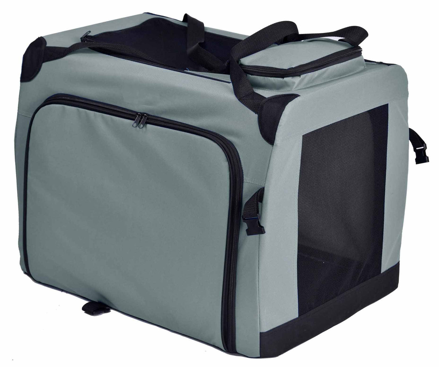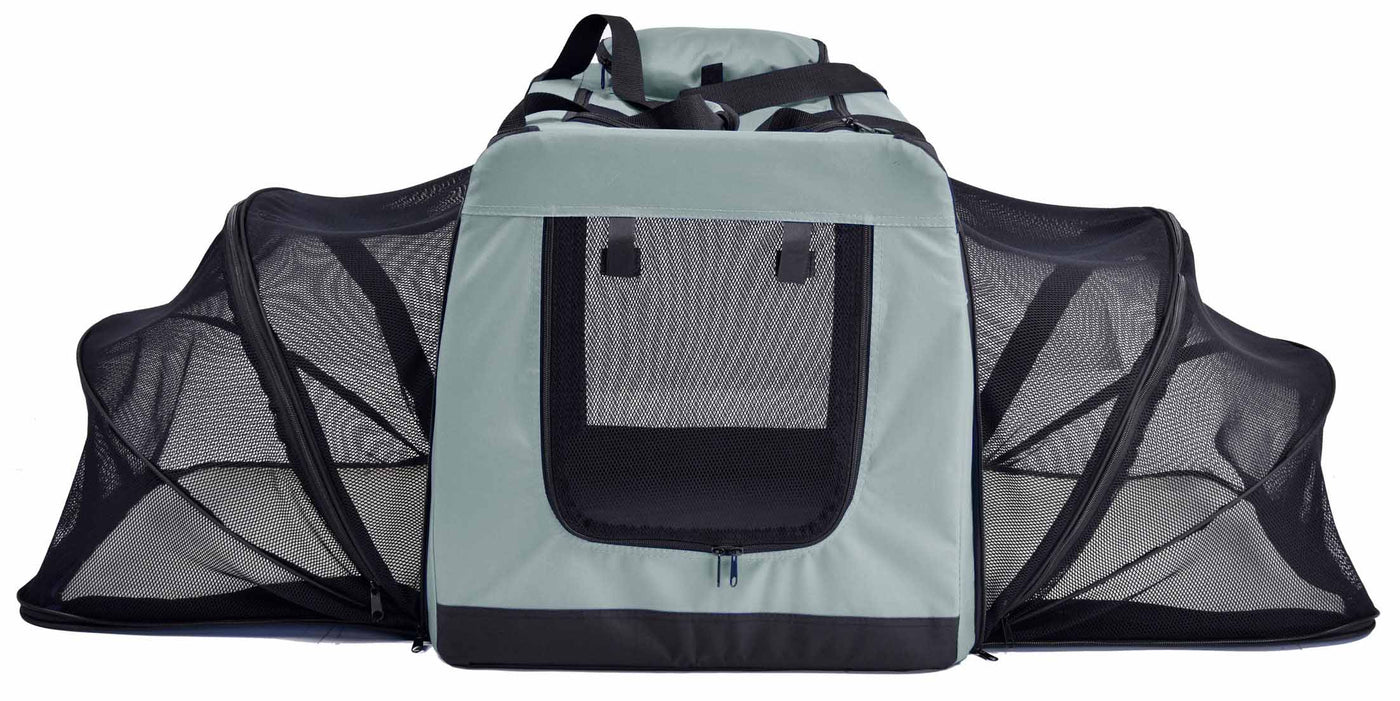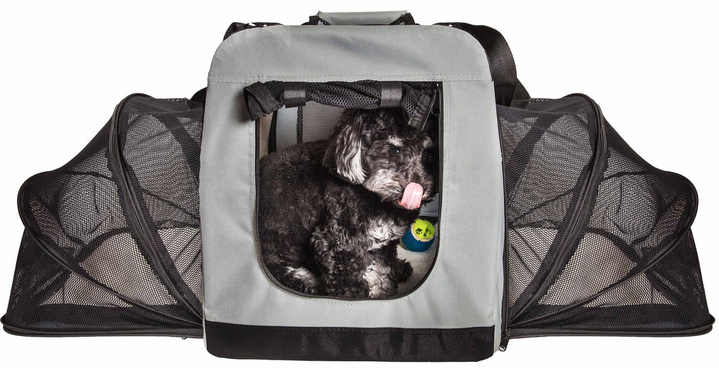 The Pet Life 'Hounda Accordion' Metal Framed Soft-Folding Collapsible Dual-Sided Expandable Pet Dog Crate is specially engineered with 3 times the lounging space. This soft folding crate features dual-sided zippers that zip open and expand on both sides like an accordion for a roomy triple lounging area experience with comfortable and breathable Sherpa-like removable resting pads that Velcro in place on each side. Both accordion-like expandable sided mesh structures feature zippers for additional pet placement. The Hounda Accordion pet crate is composed of a Durable Nylon Exo-Shell and Premium breathable mesh with a Medium-weight sturdy metallic frame that completely folds, collapses and buckles closed into place and locks into place when opened. This crate also features a zippered above-top pouch for placement of belongings and zippered frontal and panoramic entrances for easy pet placement that zips open, rolls up and Velcro's into place while offering complete ventilation and Sunview all around. Additionally this crate features above handle straps for easy carrying and a built-in safety leash holder. Spacious enough for multiple pets and perfect for travel and outdoor areas. Available in Multiple Colors and Sizes.