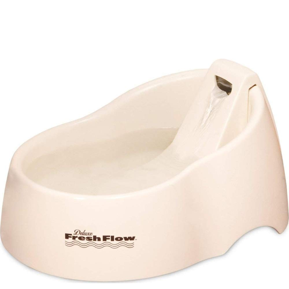 Petmate Deluxe Fresh Flow Bleached Linen 50oz The Deluxe Fresh Flow is a purifying pet fountain providing filtered water throughout the day. Perfect for multiple cat or dog households, this award-winning fountain features continuous circulating water & a unique, patented no-splash water-slide. The re-circulating flow & filter provides naturally cool & oxygenated water, attracting pets to drink more in order to help promote their health & well-being. Available in 2 colors & 3 sizes, each unit comes with a replaceable charcoal filter. Change filter every 30 days to ensure freshness.