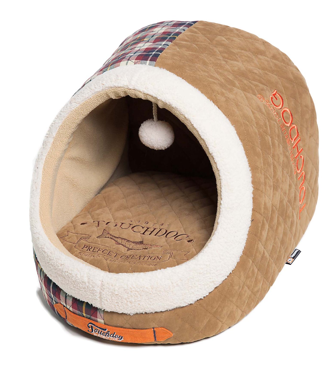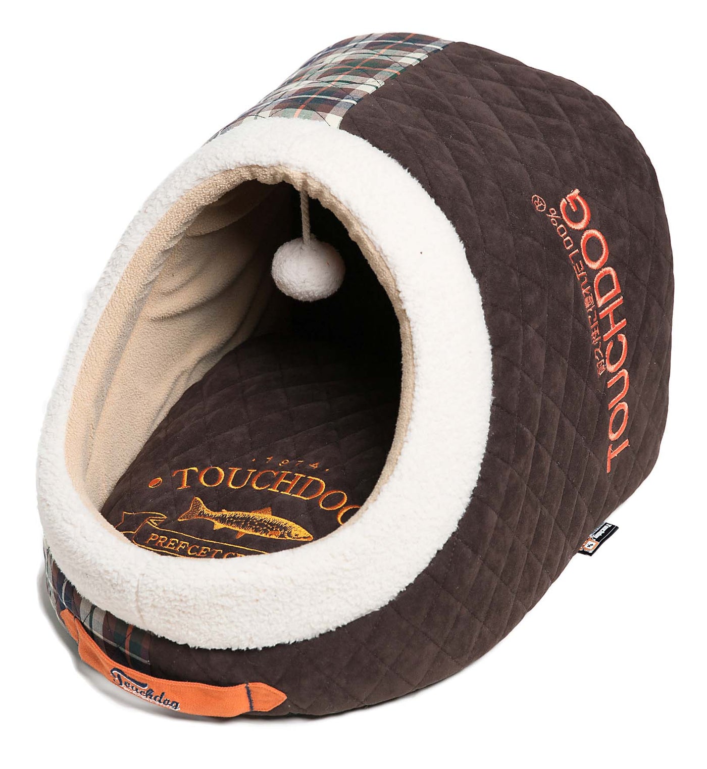The Touchdog Diamond Stitched Active-Play Indoor Panoramic Designer Dog Bed is composed of a Diamond Stitched Fleece-Cotton and Plaid Outer shell rimmed with Sherpa edging by the entrance, and inner-lined with Fleece-Polyester. Included is a matching Reversible and Removable Sherpa-Fleece dog pad. Built-in to this Pet Bed is a Ball Shaped hanging toy fixture for active-play usage. This Pet Bed has a unique panoramic design with a complimentary coordinated print on the pad and outer shell with accented Touchdog embroidery. Features a built-in side carrying Nylon handle side strap for ease of mobility. Touchdog, the leading Premium Pet Brand of Tomorrow. Available in Multiple Sizes Colors.
