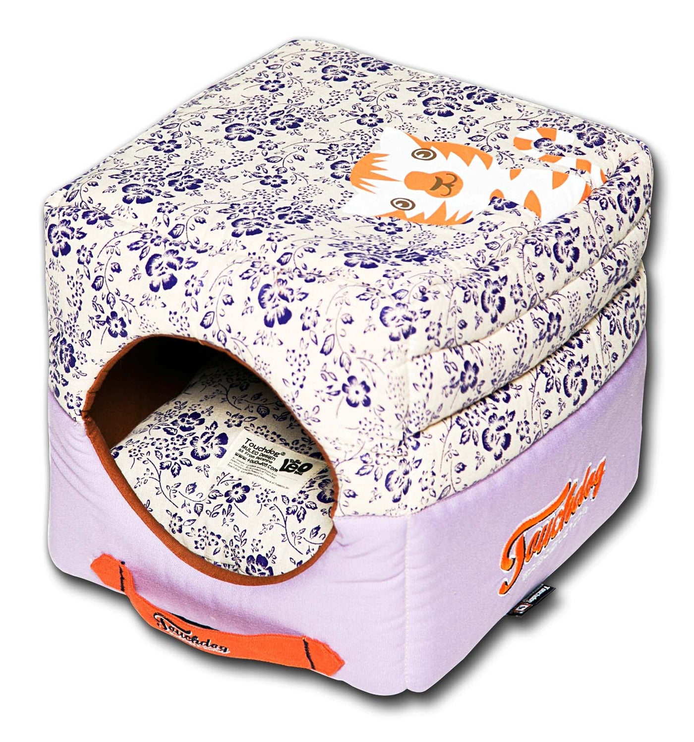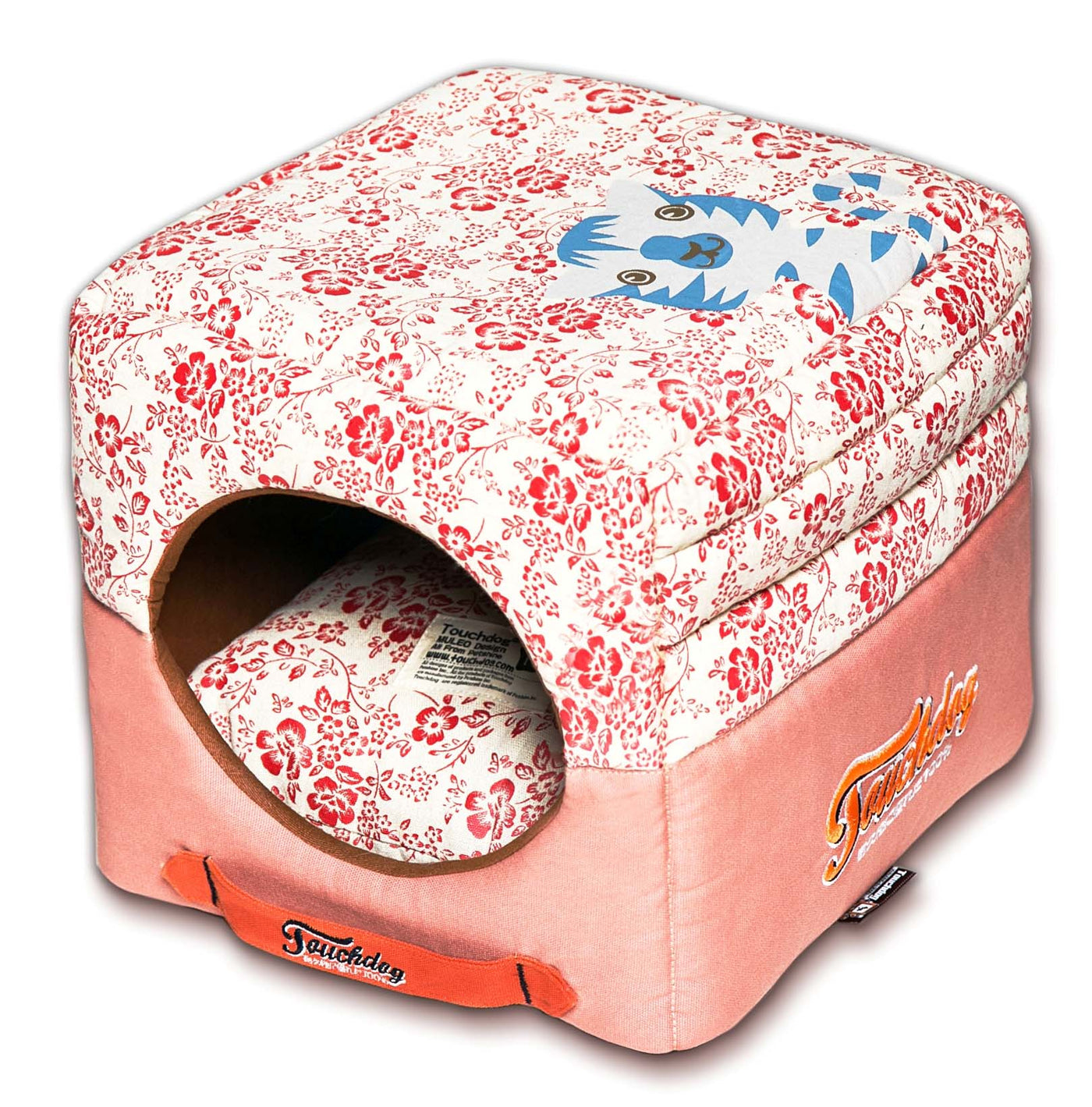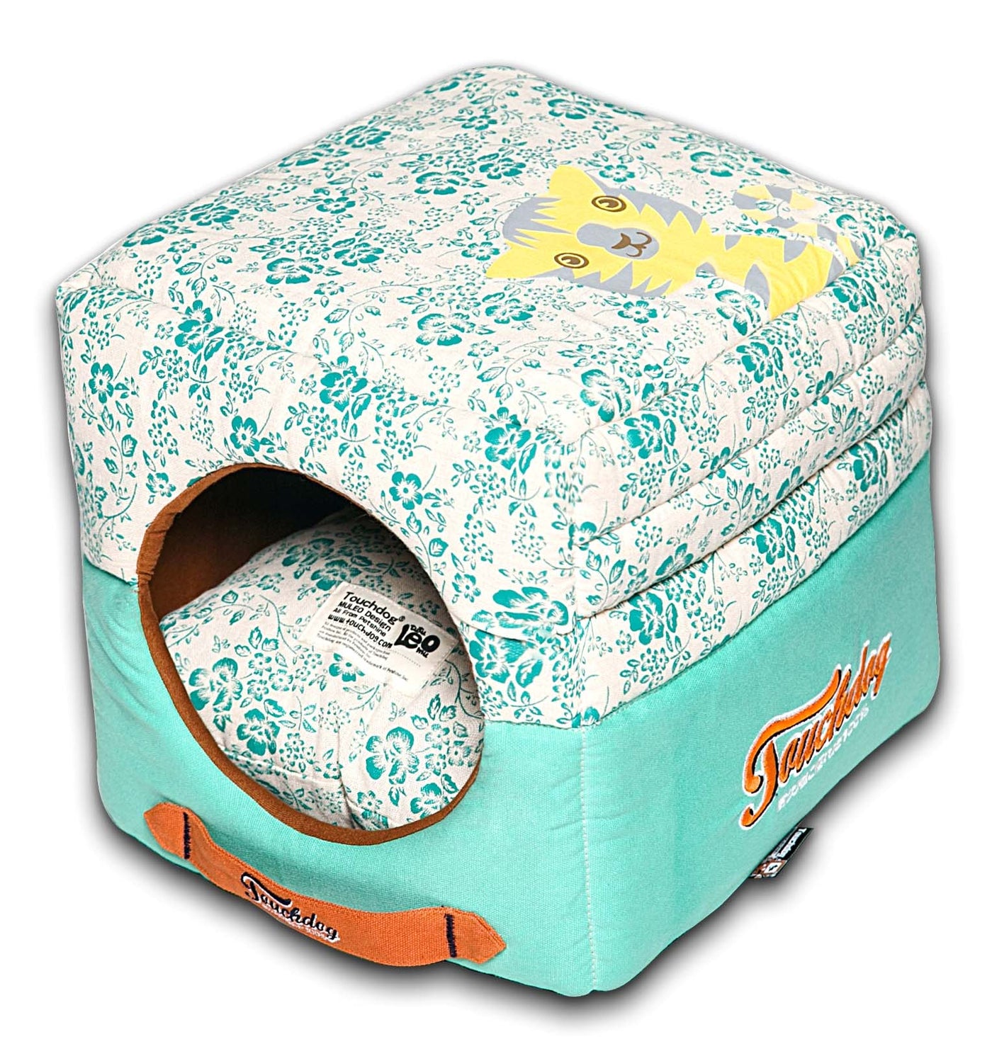 The Touchdog Floral-Galore Convertible and Reversible Squared 2-in-1 Collapsible Dog House Bed is composed of a blended Polyester-Cotton Exterior shell with a color matching Removable Pillow Cushion featuring a Thicker Grade of Polyfill with a designer print on the outside and the Touchdog Embroidered trade stamp of perfection on the outside. The Floral Pillow compliments the Outer designer shell. Features memorized stitching allowing this unique Dog Bed to convert into a Mini Indoor Pet House setting by an easy push of the top. Completed with accented trims and a built-in side carrying handlebar. Touchdog, the leading Premium Pet Brand of Tomorrow. Available in Multiple Colors.